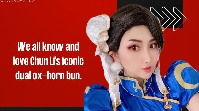 We all know and love Chun Li’s iconic dual ox-horn bun. For this, you need to part your hair down the middle first. Then, gather each section into high pigtails. Twist each pigtail into a tight bun.