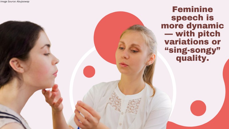 Feminine speech is more dynamic— with pitch variations or “sing-songy” quality. Try adding natural rises and falls to your sentences to hear the difference.