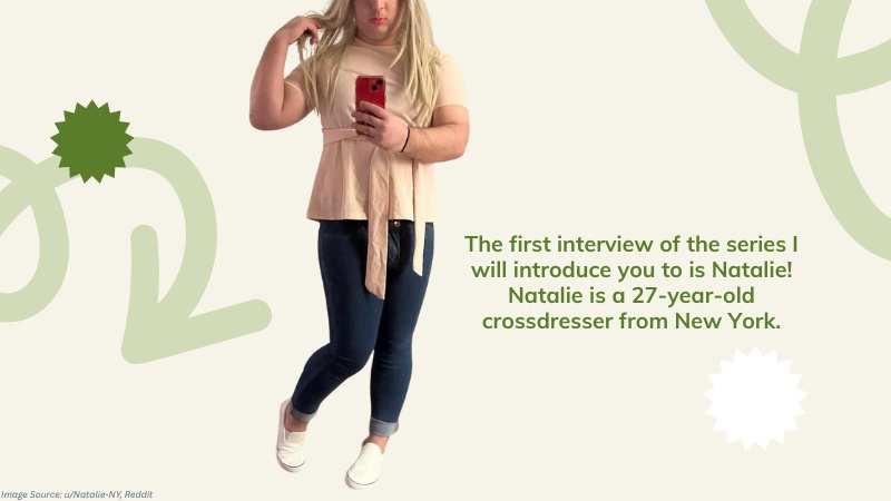 The first interview of the series I will introduce you to is Natalie! Natalie is a 27-year-old crossdresser from New York. She has always had a love for women’s clothing and accessories. She has been dressing for about 15 years now and, on average, gets to dress about 2-3 times per week currently. Outside of the crossdressing lifestyle, she also loves sports and hanging out with friends and family.