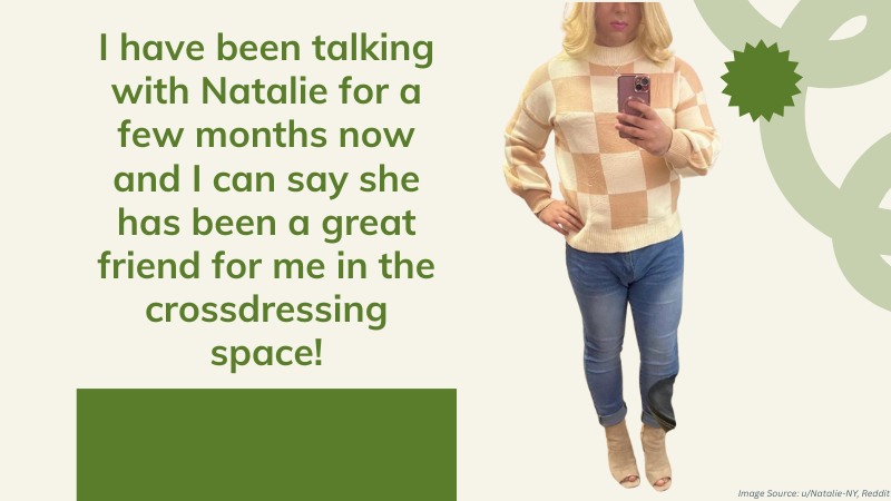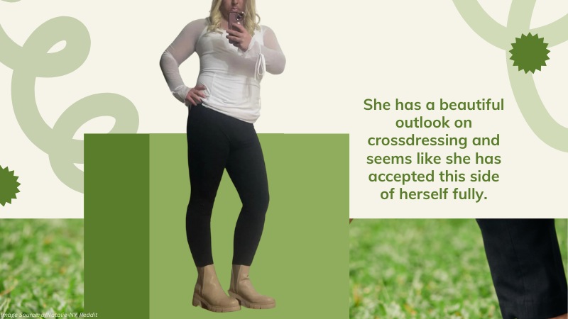 She has a beautiful outlook on crossdressing and seems to have fully accepted this side of herself. I also appreciate her interest and openness to other hobbies, as we can talk about sports and random things. It makes for a well-rounded friendship! She is also super pretty, so you should check out her Reddit or Instagram pages to see for yourself!