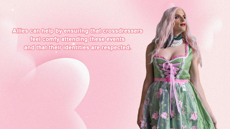 Lack of inclusivity can push crossdressers away. That’s the opposite of what we want! Allies can help by ensuring that crossdressers feel comfy attending these events and that their identities are respected.
