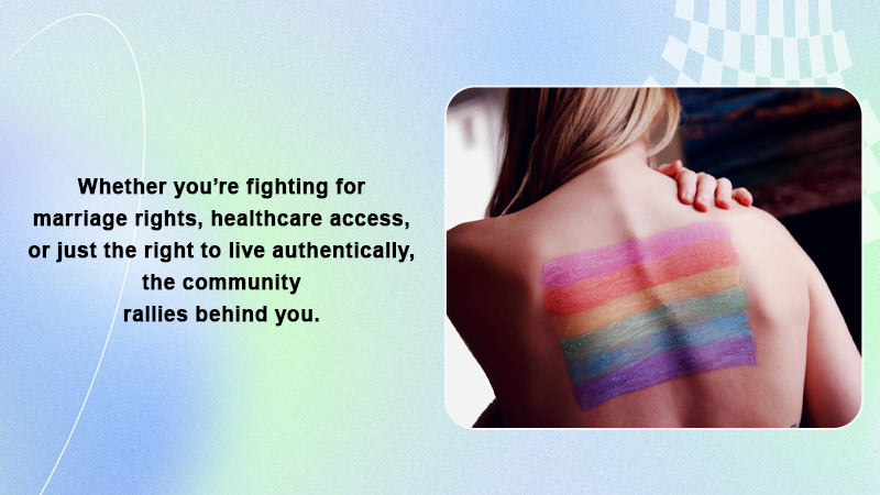 Another core value is equality. Whether you’re fighting for marriage rights, healthcare access, or just the right to live authentically, the community rallies behind you.