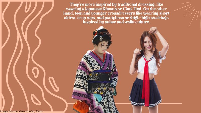 For example, let’s look at elder Asian crossdressers. They’re more inspired by traditional dressing, like wearing a Japanese Kimono or Chut Thai.