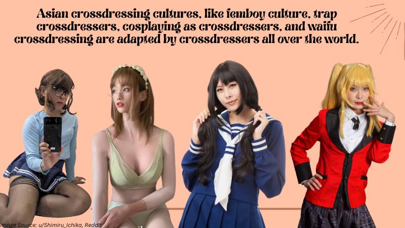 Asian crossdressing cultures, like femboy culture, trap crossdressers, cosplaying as crossdressers, and waifu crossdressing are adapted by crossdressers all over the world.