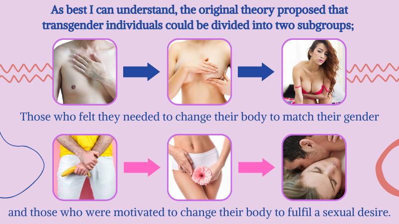 As I read more about Autogynephilia, I began to understand why people have such differing attitudes to the word.  As best I can understand, the original theory proposed that transgender individuals could be divided into two subgroups; those who felt they needed to change their body to match their gender, and those who were motivated to change their body to fulfil a sexual desire.