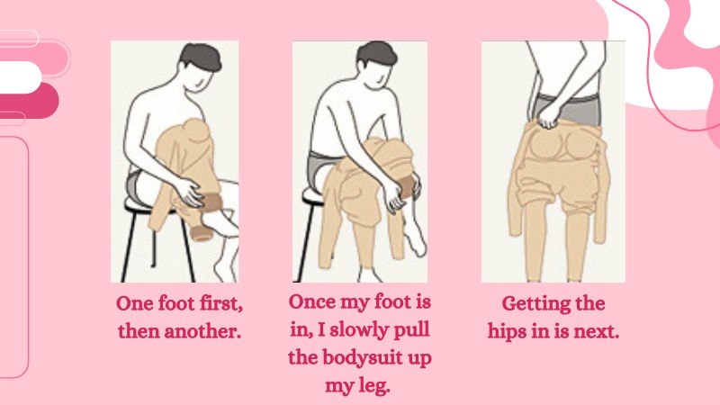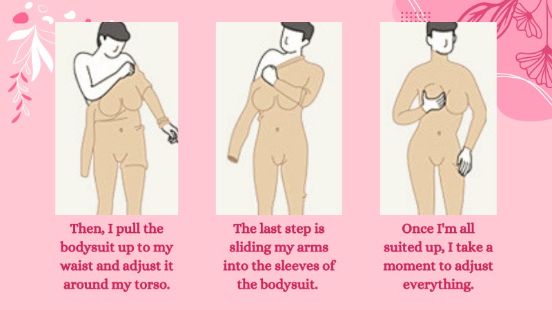 6. Then, I pull the bodysuit up to my waist and adjust it around my torso. This part can be snug, so do deep breaths to relax.