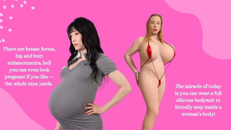 There are breast forms, hip and butt enhancements, hell you can even look pregnant if you like — the whole nine yards. The miracle of today is you can wear a full silicone bodysuit to literally step inside a woman’s body!