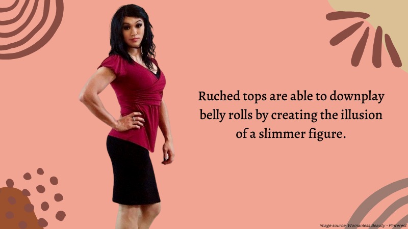 Ruched tops are able to downplay belly rolls by creating the illusion of a slimmer figure. The gathering of fabric in strategic places can help to camouflage any problem areas. When choosing a ruched top, it’s important to pay attention to the placement of the ruching.