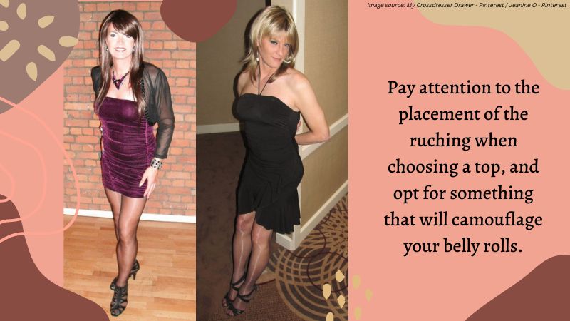 Using Ruched tops is a great way to help downplay any belly rolls you may have as an MTF crossdresser. Ruching is a gathering of fabric that is often sewn into garments in strategic places.