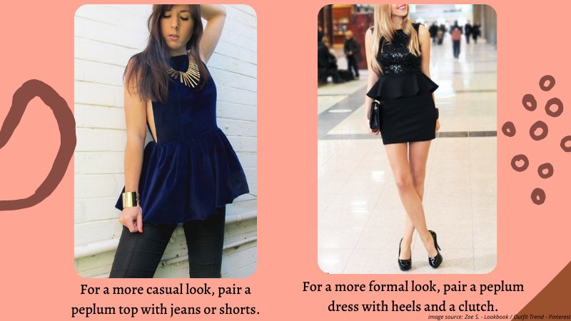 One great thing about peplums is that they come in a variety of styles. For a more casual look, pair a peplum top with jeans or shorts. For a more formal look, pair a peplum dress with heels and a clutch.