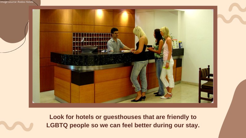 Look for hotels or guesthouses that are friendly to LGBTQ people so we can feel better during our stay.