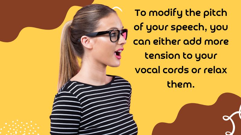 To modify the pitch of your speech, you can either add more tension to your vocal cords (to make them vibrate faster and create a higher pitch) or relax them (to make them vibrate more slowly and create a lower pitch).