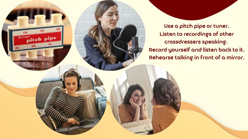 Additionally, many crossdressers find it helpful to listen to audio recordings of women speaking and try to copy their cadence and mannerisms.