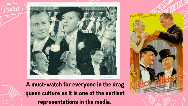 An aspiring actress named Suzanne helps out a friend and covers his shift for him at work. The job was at a little cabaret in Berlin as a female impersonator. After the show, an agent approaches Suzanne with an interesting deal thinking she is a man. She becomes famous in the process and tours around the country. She is then harassed by a fan, and Viktor has to help her as the drag queen Victoria. You may be familiar with the plot as it has been revisited several times. One with the same name in 1982. Another version of this groundbreaking German film is “First a Girl” (1935). A must-watch for everyone in the drag queen culture as it is one of the earliest representations in the media. And an excellent one too!