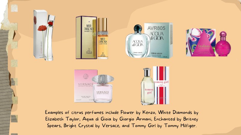 Examples of citrus perfumes include Flower by Kenzo, White Diamonds by Elizabeth Taylor,
