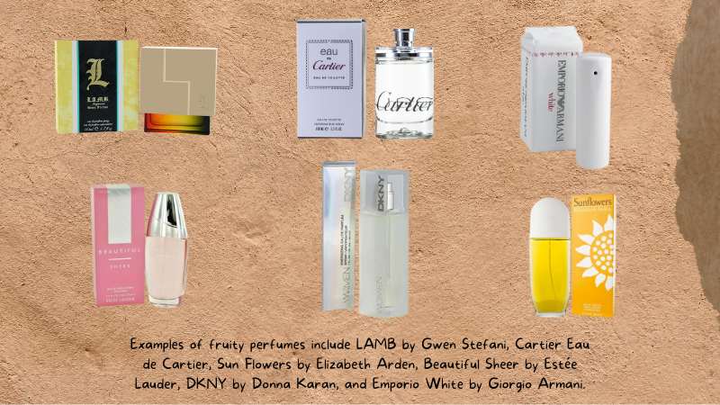 Examples of fruity perfumes include LAMB by Gwen Stefani, Cartier Eau de Cartier,
