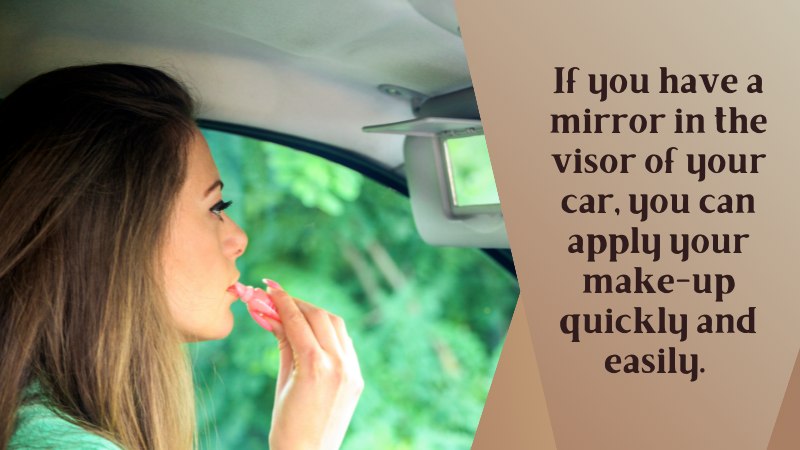 When you are in a rush, it can be hard to apply makeup, lipstick, and mascara in the morning. But if you have a mirror in the visor of your car, you can apply it quickly and easily. Look into your visor and select one of the two mirrors. Then, use the mirror to apply your makeup. When you get to work after putting your makeup on, you will feel better about yourself when you look in the mirror.