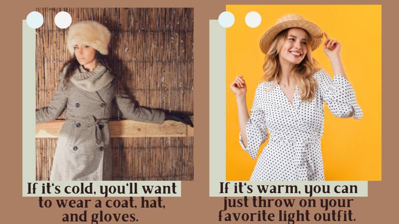 If it’s cold, you’ll want to wear a coat, hat, and gloves. If it’s warm, you can just throw on your favorite light outfit. It’s important to get your clothing the night before to wake up and get dressed quickly. If you don’t have the proper attire, it can make for a rough day for any weather, so it’s important to dress appropriately!