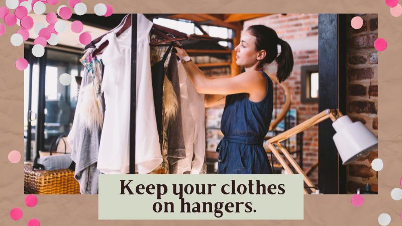 Keep your clothes on hangers and place them in your closet or on a hanger suspended from a doorknob. You can also hang them from an ironing board or a hook that you can affix to the inside of your closet door. Keeping your clothes out of the way but still readily available is one of the best ways not to get stressed out and will save you loads of time too!