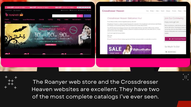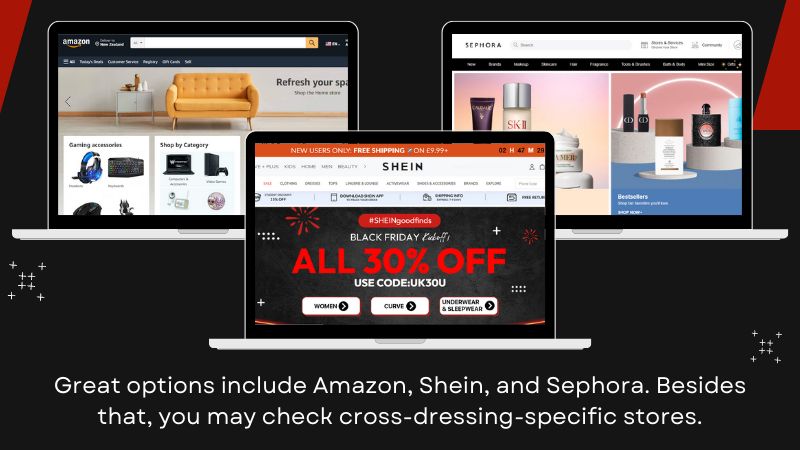 Black Friday allows our sisters to buy what they need for more reasonable prices. Many well-known stores offer significant discounts for clothing and other stuff. You may get excellent deals on makeup bundles and outfits to expand your wardrobe. Great options include Amazon, Shein, and Sephora. Besides that, you may check cross-dressing-specific stores. They usually have special offers on shapewear, breast forms, and wigs. The Roanyer web store and the Crossdresser heaven websites are excellent. They have two of the most complete catalogs I’ve ever seen. The stores I mentioned tend to have great deals during the shopping season. But the discounts they offer during Black Friday are something special.