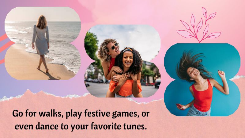 Also, Just because you’re on vacation doesn’t mean you have to be a couch potato. Go for walks, play festive games, or even dance to your favorite tunes.