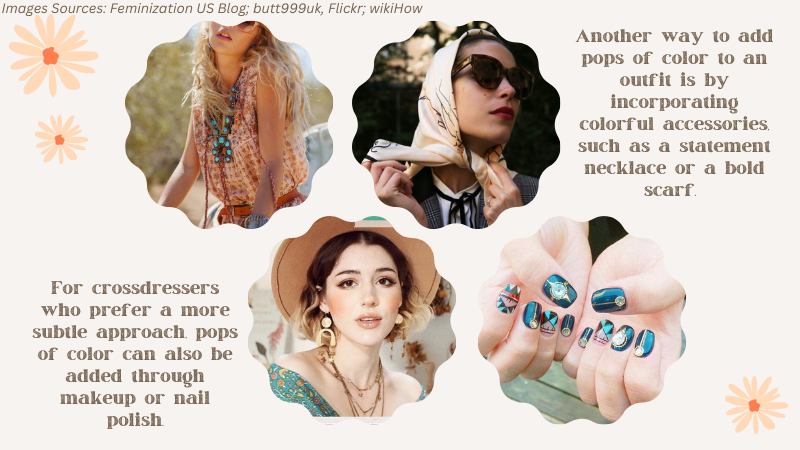 Another way to add pops of color to an outfit is by incorporating colorful accessories, such as a statement necklace or a bold scarf. These items can create a focal point and draw attention to certain body areas, such as the neck or waist. For crossdressers who prefer a more subtle approach, pops of color can also be added through makeup or nail polish. A bold red lip adds personality to a neutral outfit. Bright blue nail polish also creates a colorful touch. Pops of color offer versatile looks. They can be playful, whimsical, sophisticated, or elegant. Boho chic style celebrates individuality and expression. It’s perfect for incorporating vibrant colors and creating fun looks.
