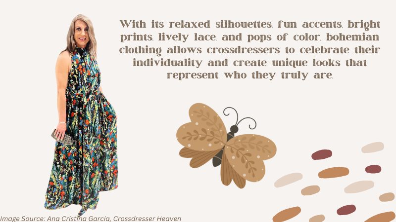 In conclusion, boho chic style is a great way for crossdressers to express their personality through fashion. With its relaxed silhouettes, fun accents, bright prints, lively lace, and pops of color, bohemian clothing allows crossdressers to celebrate their individuality and create unique looks that represent who they truly are.