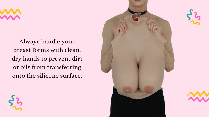 Always handle your breast forms with clean, dry hands to prevent dirt or oils from transferring onto the silicone surface.