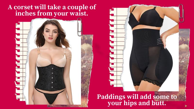 A corset will take a couple of inches from your waist, while paddings will add some to your hips and butt.