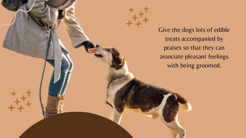 For instance, give the dogs lots of edible treats accompanied by praises so that they can associate pleasant feelings with being groomed.
