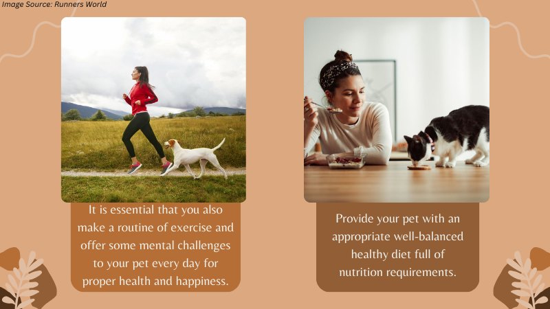 It is essential that you also make a routine of exercise and offer some mental challenges to your pet every day for proper health and happiness.