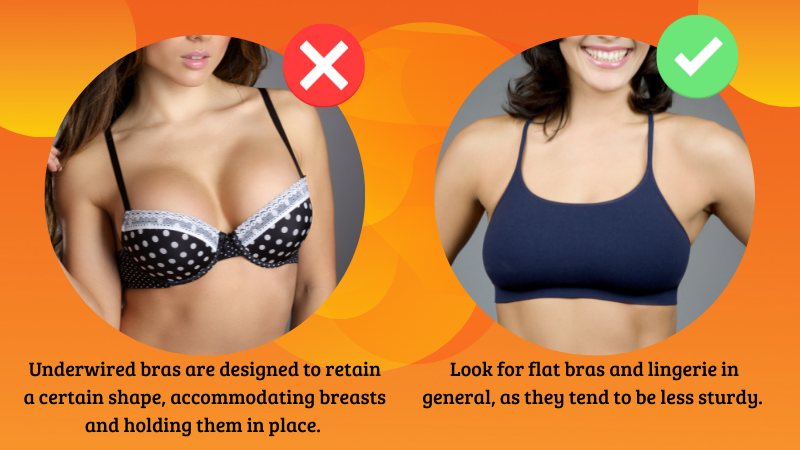 Look for flat bras and lingerie in general, as they tend to be less sturdy. These are also cheaper and will not retain their original shape for too long. They will adapt to your chest, granting some extra comfort.