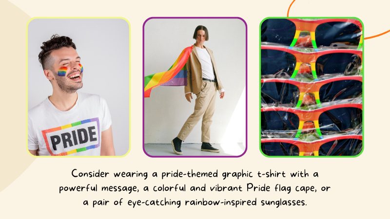 Consider wearing a pride-themed graphic t-shirt with a powerful message, a colorful and vibrant Pride flag cape, or a pair of eye-catching rainbow-inspired sunglasses.