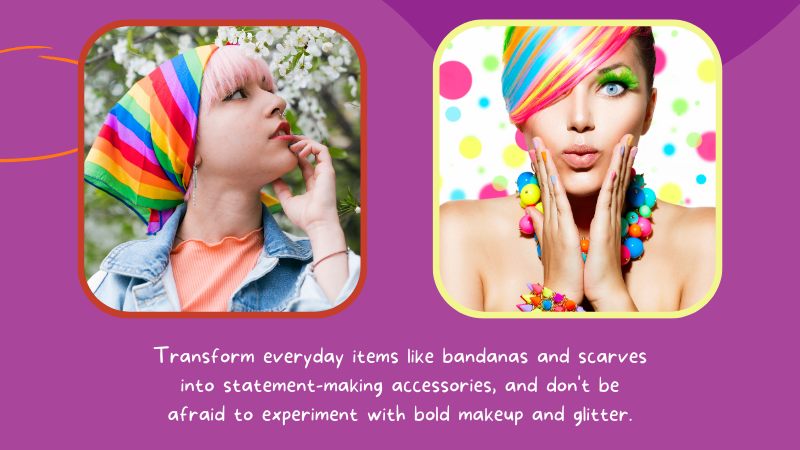 Transform everyday items like bandanas and scarves into statement-making accessories, and don’t be afraid to experiment with bold makeup and glitter.