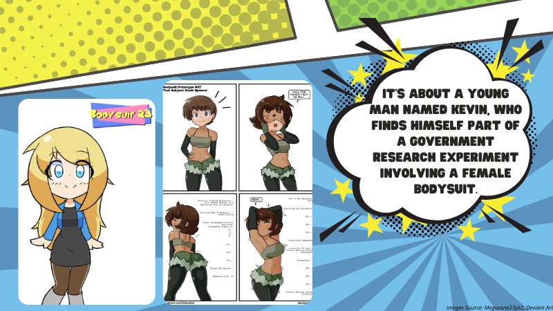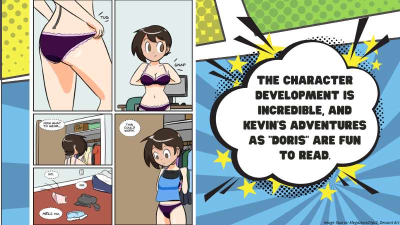 I’ll start with this one since it has a special place in my heart. It’s a webcomic available at DeviantArt and the author’s website that has been running for a while now. It’s about a young man named Kevin, who finds himself part of a government research experiment involving a female bodysuit. This was my first contact with this kind of thing and what encouraged me to explore my gender identity. Thanks to that, I would discover Roanyer’s products a couple of years later. But the main reason I’m recommending it is that it’s a very well-written story with deep characters and tons of emotional moments. It’s one of the best, if not the better cross-dressing stories I have ever read. The character development is incredible, and Kevin’s adventures as “Doris” are fun to read. Younger cross-dressers will most likely relate to most characters and enjoy the series.