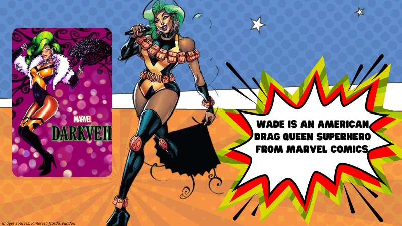 Wade is an American drag queen superhero from Marvel comics. Darnell grows up to be a massive fan of comic books and superheroes and a great drag performer. He creates “Shade,” his drag persona, inspired by heroes from New York. Ans she performs as Shade before gaining mutant powers and becoming a hero herself. Her powers include manipulating dark energy. She uses it to teleport herself and others through another dimension. She adopts “Dark Veil” as her superhero alias and participates in the mutant pride parade.