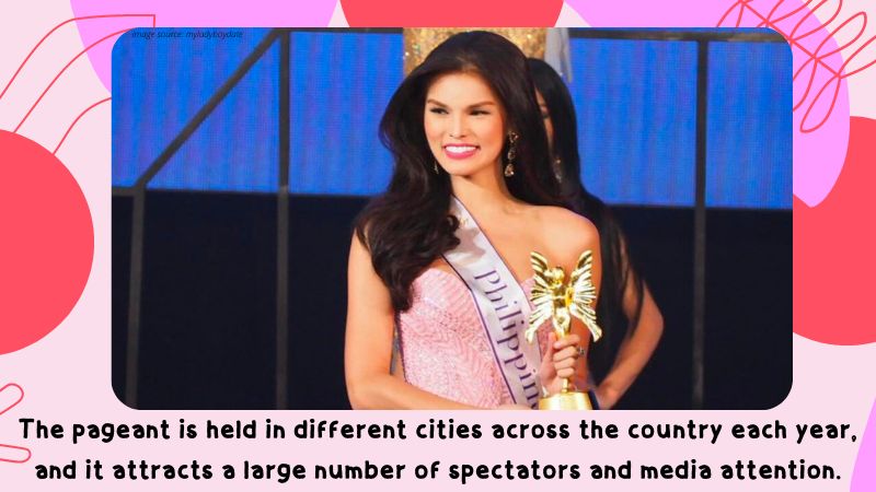The pageant is held every year in different cities across the country, and it attracts a large number of spectators and media attention. The contest is divided into several rounds, including an evening gown competition, a talent show, and a question-and-answer session.