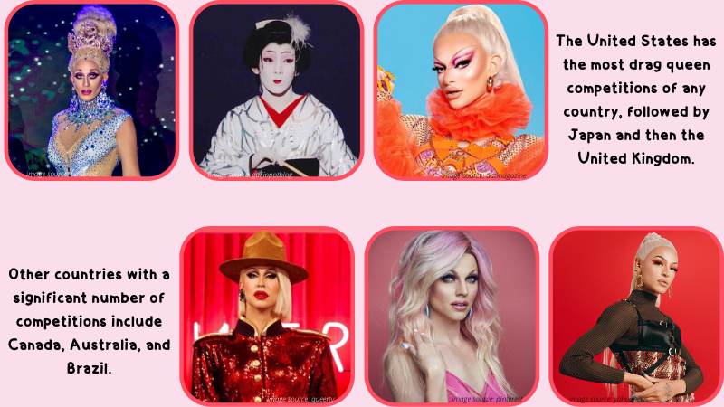 The United States has the most drag queen competitions of any country, followed by Japan and then the United Kingdom. Other countries with a significant number of competitions include Canada, Australia, and Brazil.