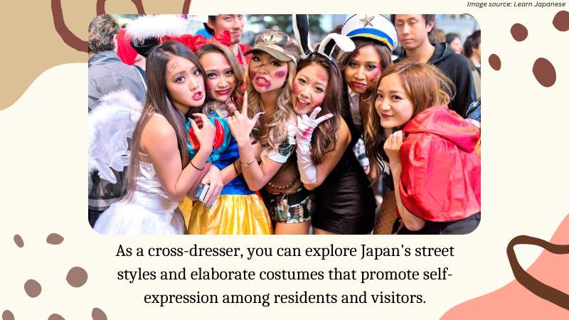 As a cross-dresser, you can explore Japan’s street styles and elaborate costumes that promote self-expression among residents and visitors.