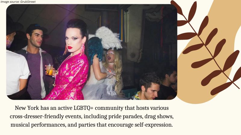 New York has an active LGBTQ+ community that hosts various crossdresser-friendly events, including pride parades, drag shows, musical performances, and parties that encourage self-expression.