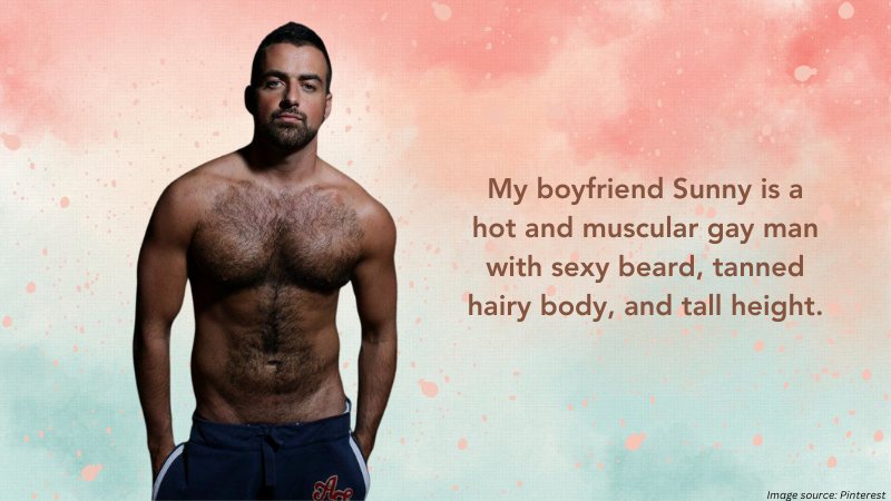 My boyfriend Sunny is a hot and muscular gay man with a sexy beard, tanned hairy body, and tall height. He is like 6ft tall.