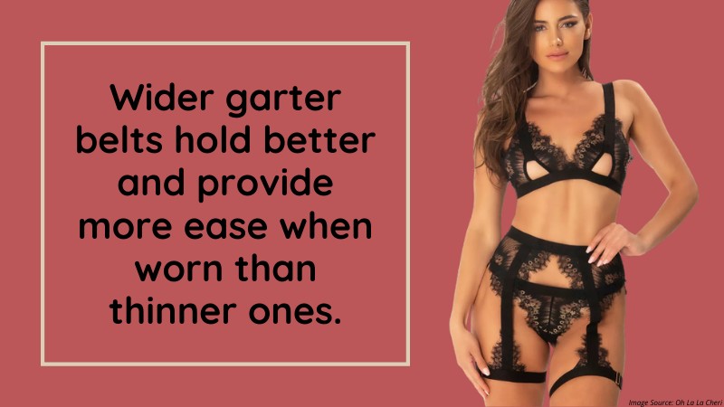 Personally, I prefer wider garter belts because they hold better and provide more ease when worn than thinner ones. However, they’re not commonly seen because they’re underneath our crossdressing outfits, so any amount of coverage is good.
