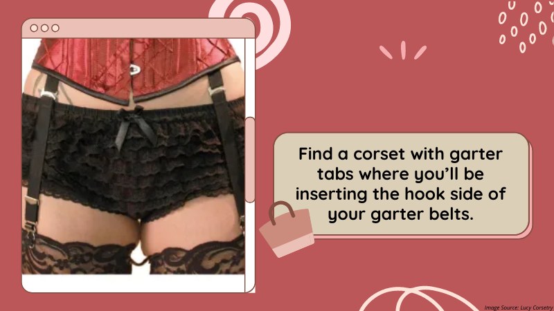 - It also helps if you find a corset with garter tabs. These garter tabs are small loops on your corset where you’ll be inserting the hook side of your garter belts. Ensure that all straps are attached to the corset before hooking them with your thigh-high stockings.
