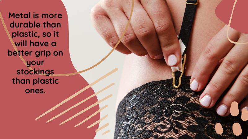 The hook and clasps of garter belts come in metal or plastic. I know it’s completely up to you, but I suggest choosing one with metal clasps. Metal is more durable than plastic, so it guarantees that it will have a better grip on your stockings than plastic ones. Additionally, plastic clasps can snap or break when you pull too much.