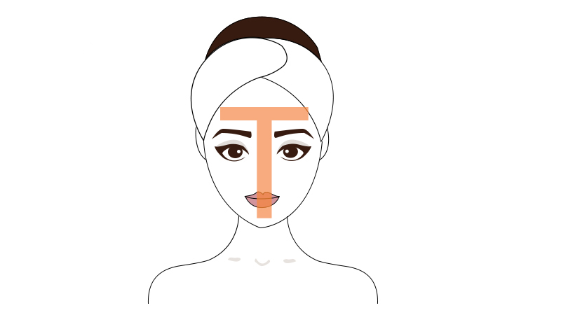 Crucial spots where you should be checking your face are your cheeks and your ‘’T-zone’’ defined by a horizontal line drawn across your forehead and a vertical line through your nose and chin.