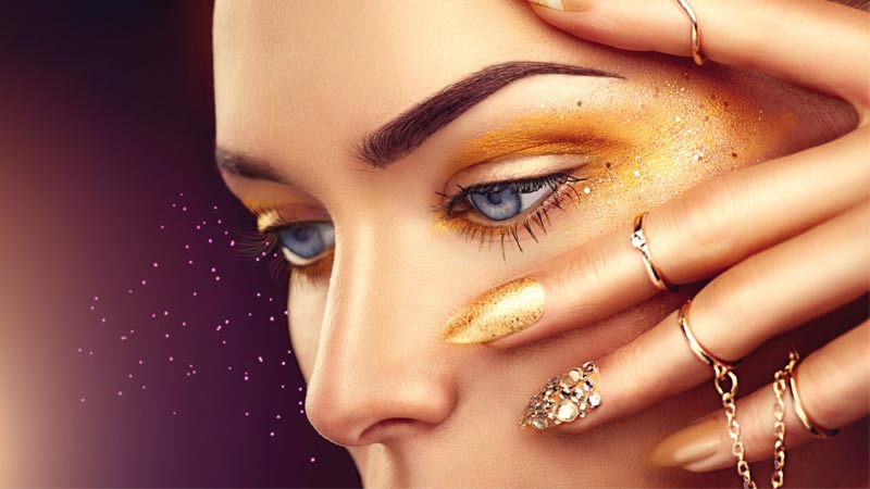 Instead, if you are going with the golden theme, try matching your nails with golden eye shadow and colored jewelry.