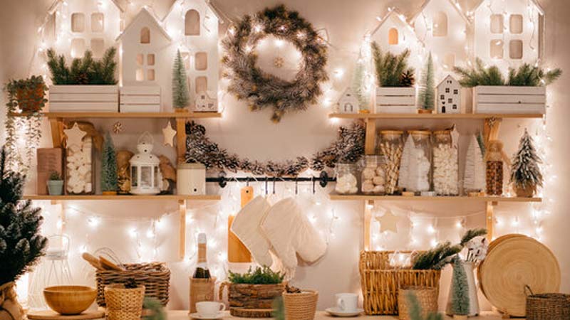 For the walls, you can use lights and garland wreaths.