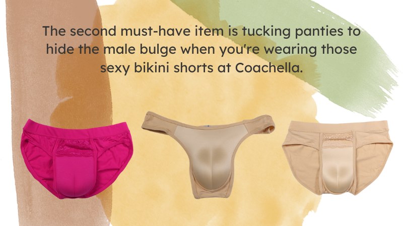 The second must-have item is tucking panties to hide the male bulge when you’re wearing those sexy bikini shorts at Coachella.