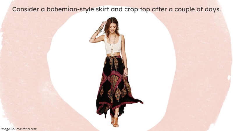 So, consider a bohemian-style skirt and crop top after a couple of days. Just carry a bohemian skirt or a chambray shirt.
