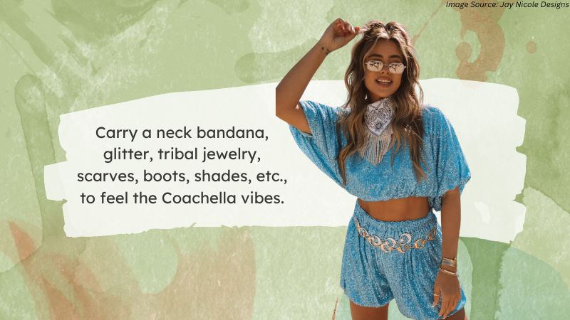 Yes, carry a neck bandana, glitter, tribal jewelry, scarves, boots, shades, etc., to feel the Coachella vibes.